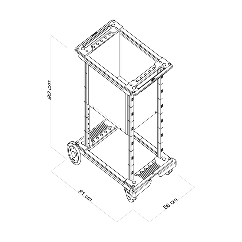 Equipado com prateleiras, tampos e suportes estrategicamente posicionados, o carrinho multiuso oferece uma estocagem eficiente e um armazenamento seguro.