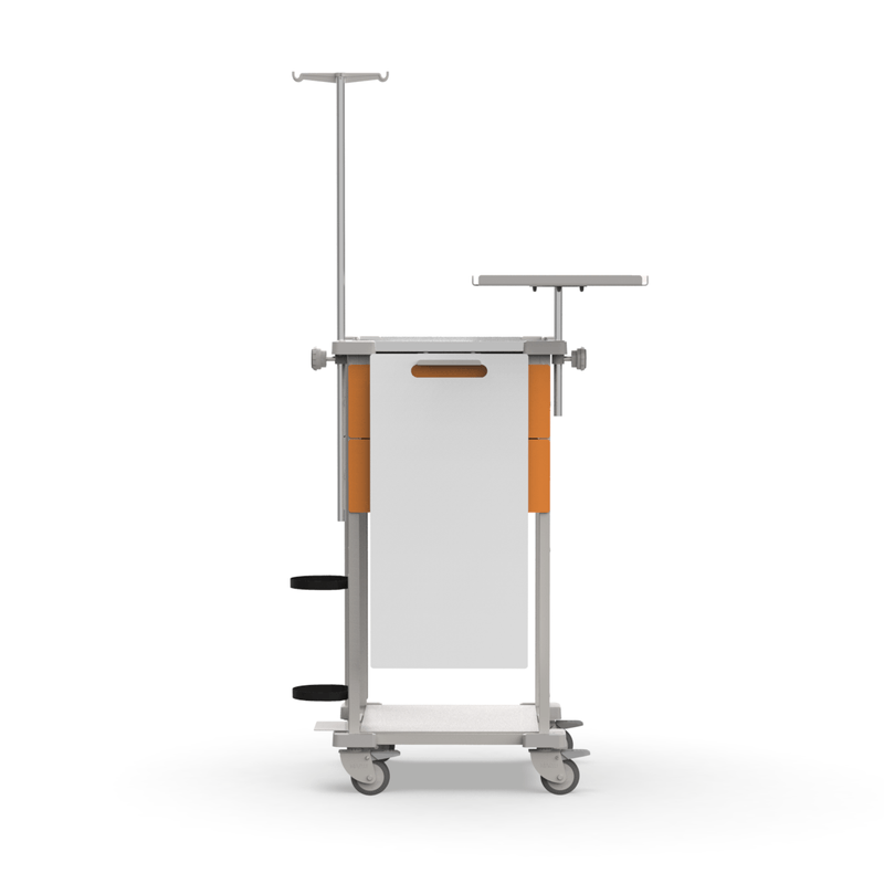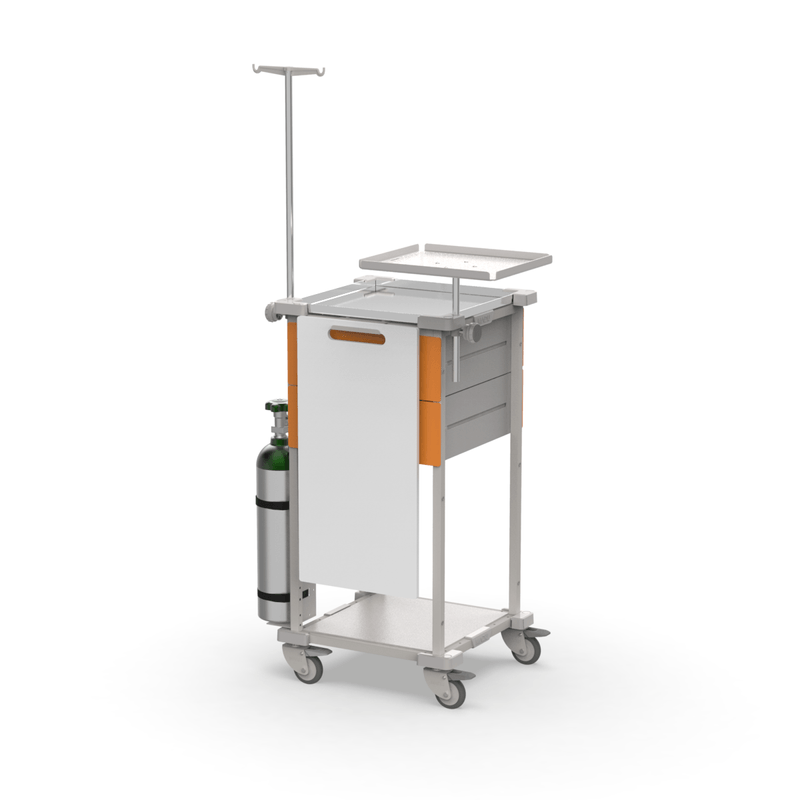 MóveisCarrinhosCarrinho com GavetasCarrinho de Emergência 2 Gavetas Laranja e 1 Prateleira com Tampo Inox e Suporte para Equipamentos – MAD.U Extra 385