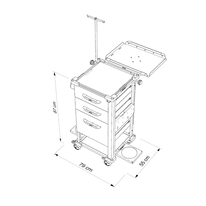 Carrinho de Sedação 3 Gavetas, Tampo Inox e Suportes – MAD.U Extra 385