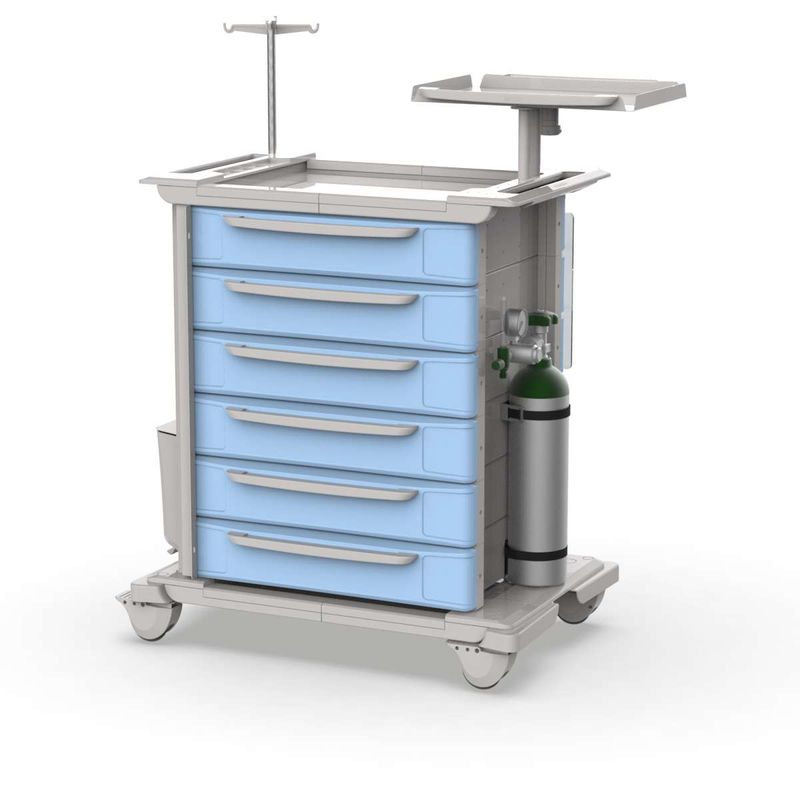 Carrinho de Emergência Hospitalar com 6 Gavetas Azul Claro, Fecho Geral e Suportes – MAD.U One 740. MADU000037.01.03.EST