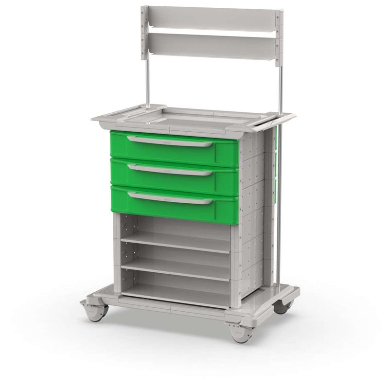 Equipado com prateleiras, tampos e suportes estrategicamente posicionados, o carrinho multiuso oferece uma estocagem eficiente e um armazenamento seguro.